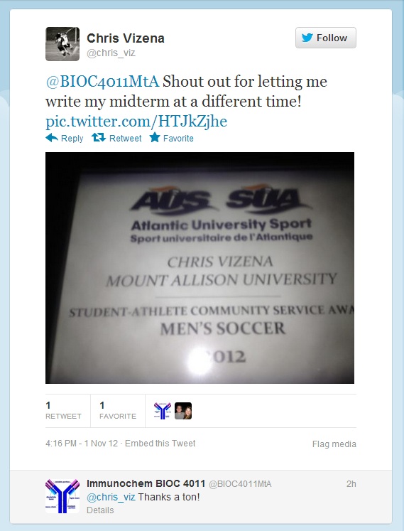 Within the same week, the male student-soccer player expressed an interest in going to an AUS banquet, also being held in PEI on Thursday night. Again, he was happy to write his midterm ahead of time, rather than defer it until after returning from his athletic event. And so, on Thursday morning, 8.5 hours ahead of schedule, he wrote his Immunochemistry midterm, and proceeded to PEI afterwards. He did promise, when leaving, that should he win the award he was hoping to receive at the banquet, he would tweet about it and give a deserved “shout out.”