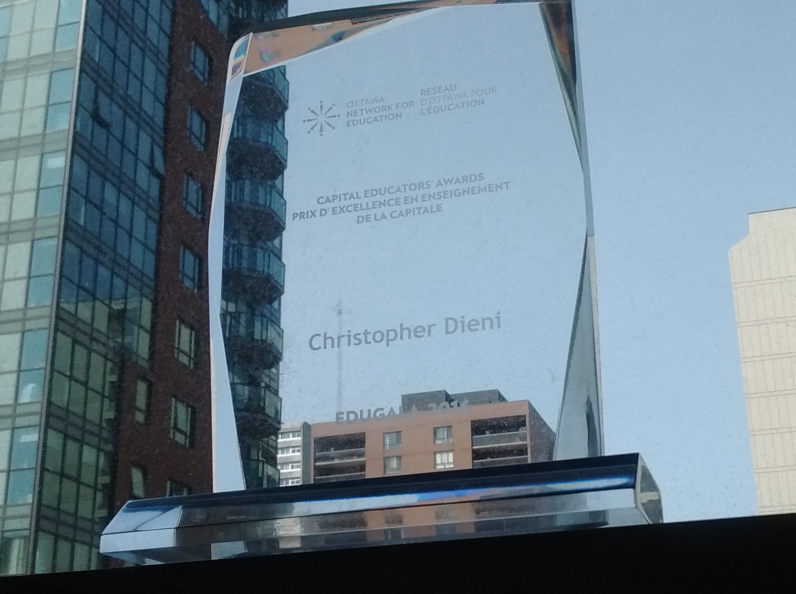 Last night, Chris received one of the 18 Capital Educators’ Awards handed out at EduGala 2016. The event, and the award, recognized 63 finalists (and 18 award winners selected from among them) who represent excellence in education across Ottawa. In the words of the Ottawa Network for Education: “In 2001, the Ottawa Network for Education (ONFE), in partnership with a group of business and education leaders launched the annual Capital Educators’ Awards and gala celebration – aptly named Edugala – to raise the profile of public education and to recognize and celebrate the dedication and achievements of our local educators. These awards are unique; Ottawa is the only community in Canada that celebrates the contributions of its educators across the whole spectrum of education from elementary to post-secondary.”