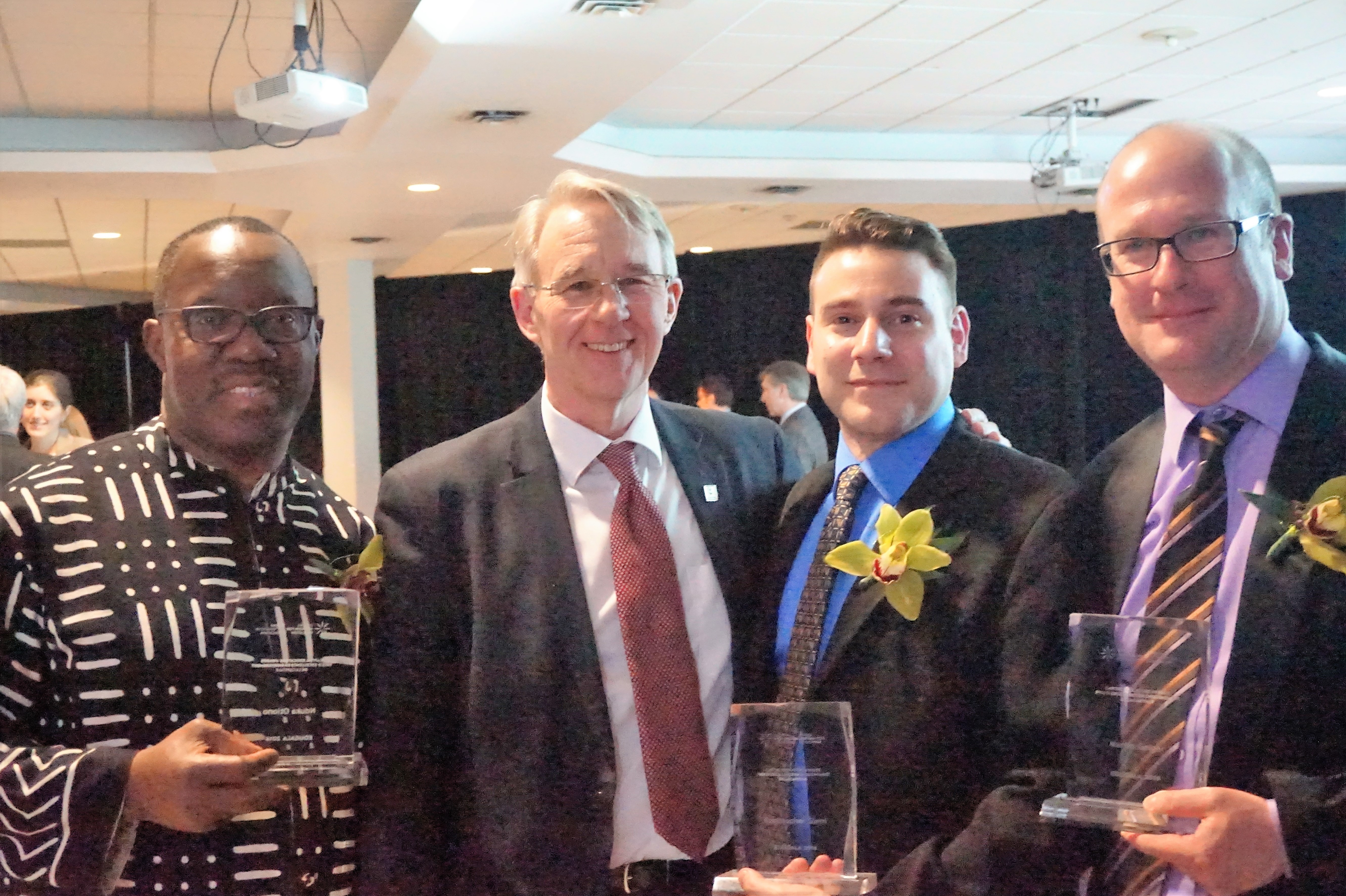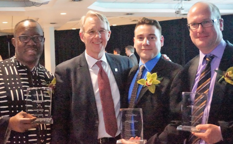 Carleton University’s winners of the 2016 Capital Educators’ Awards. L-R: Dr. Nduka Otiono (Assistant Professor, Institute of African Studies), Dr. Peter Ricketts (Carleton University Provost & Vice-President, Academic), Dr. Christopher Dieni (Contract Instructor, Institute of Biochemistry), Dr. Martin Geiger (Assistant Professor, Department of Political Science). Photo is courtesy of Dr. Otiono.